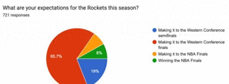 结合上赛季的表现,如今阵容更加豪华,球迷谈及火箭新赛季战绩,自然有更高期待。根据记者凯利-艾科统计,有66%左右球迷,认为火箭进入西决是基本目标,相反对于杜兰特倒是谨慎看好观点。